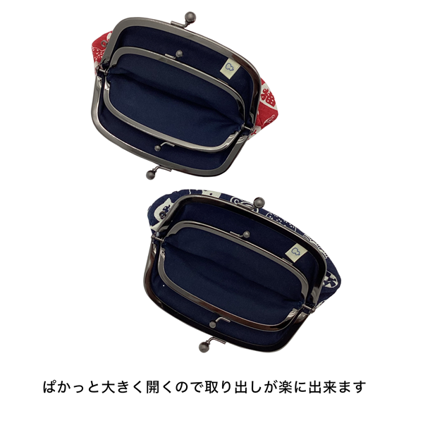 にゃんこもん―たくさんの小紋柄のねこちゃんがかわいくデザインされている、にゃんこもんシリーズの親子がま口です。親子がま口は、名前の通り、がま口の中にもう一つがま口がついています。このがま口は、スリムでコンパクトですが、高さがしっかりあるため、紙幣やカードも入れることができます。※紙幣は、二つ折り、三つ折りどちらにも対応しています。小銭の他にお札やクレジットカードなどが入るお財布は大きくなりがちで、カバンの中では、かさ張ってしまいますが、親子がま口はスリムでコンパクトな設計なので邪魔になりません。