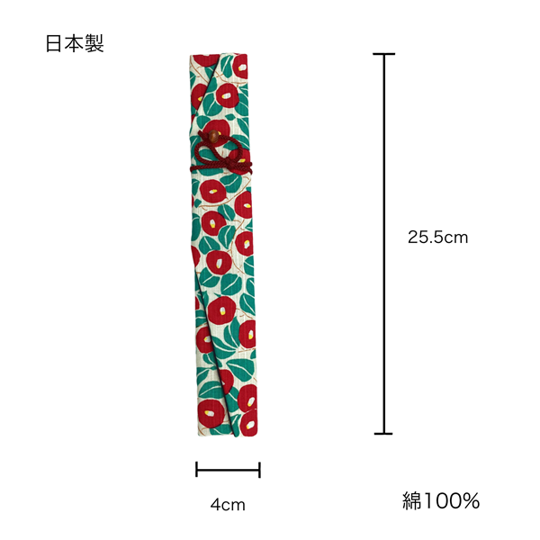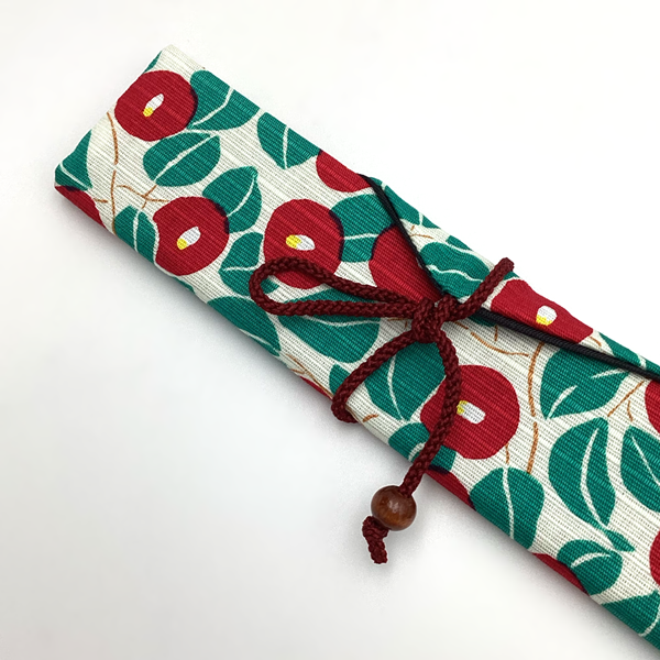 夢二椿の生地でお箸をいれてお箸袋を作りました。紐をくるくるっと巻いてください。23センチのお箸まででしたらちょうど良い感じに包む事が出来ます。 あと数センチ長くても包むことは可能ですがお勧めは、23センチ以内のお箸です。