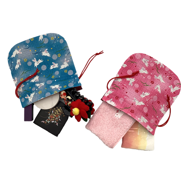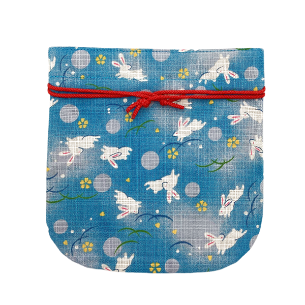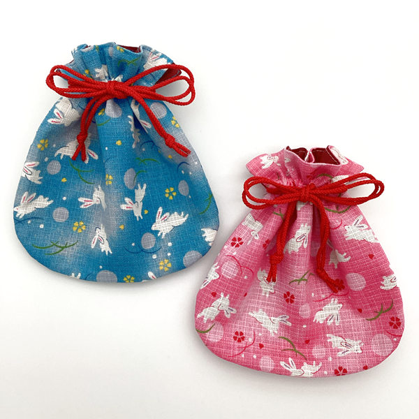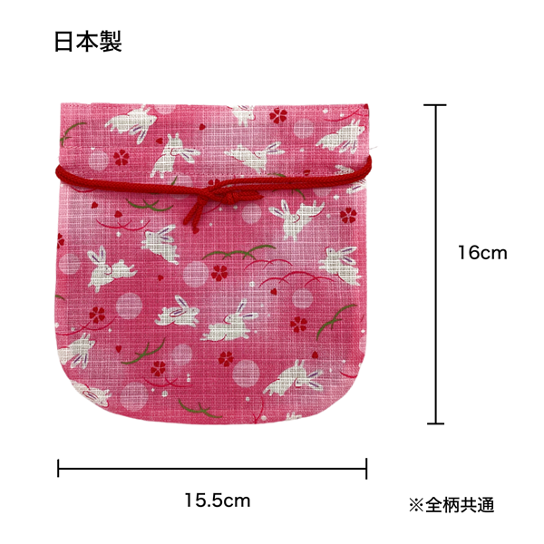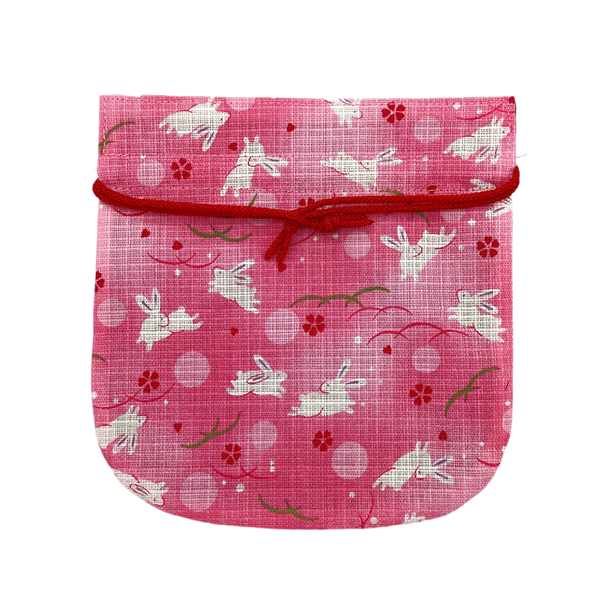 使い勝手良く、使いやすいミニ巾着です。化粧品入れや、コップ入れなど用途も色々。使いやすい大きさで、バッグの中の小物整理や旅行の仕分け用にも活躍します。アクセサリーなど入れても良いですね。小桜の中を、元気良く跳ね回るうさぎがたくさんいて、癒されます。売り場を華やかに演出します。#うさぎ #日本製 #縁起物 #Rabbit #Lucky